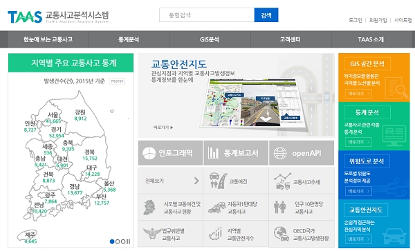 TAAS는 현재 교통사고 관련 각종 통계와 GIS 교통사고 분석 기능을 제공하고 있다. 교통 약자와 야간 사고 등 특정 사고 다발지역과 전국 도로의 교통안전도도 제공된다.