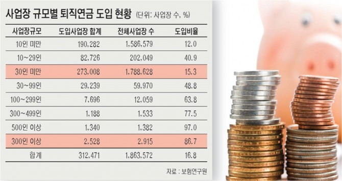 보험연구원은 20일 ‘중소기업 퇴직연금 도입 실태 및 대책 방향’을 주제로 한 보고서에서 중소기업 근로자의 수급권 보호와 노후소득 보장 강화를 위해 현재 퇴직금제도와 퇴직연금제도 등으로 이원화된 퇴직급여제도를 퇴직연금제도로 단일화하고 중소기업의 퇴직연금 도입 확대를 위한 재무적‧비재무적 재원 대책이 필요하다고 밝혔다.
