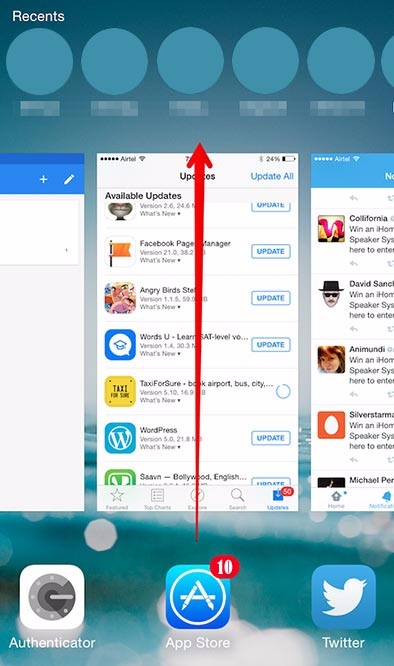 이미지 확대보기아이폰과 아이패드의 홈 버튼을 더블 클릭하면 사용하지 않는 응용 프로그램의 창이 뜨고 이를 위로 밀면 강제 종료된다. 그렇게 하면 iOS 기기의 성능을 향상시키고 배터리 수명을 연장할 수 있을 것인가에 대한 논란은 지금까지도 수차례 있어 왔다.