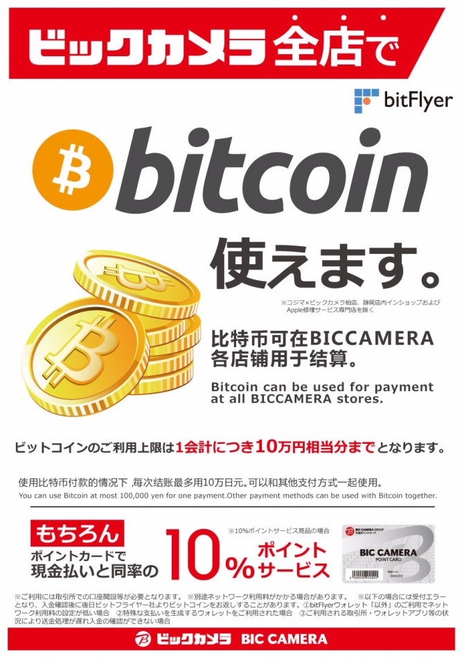 7월 26일부터는 자회사인 '코지마'와 '소프맵'의 일부 점포를 제외한 전 매장(59점포)에서 비트코인에 의한 결제를 할 수 있게 된다. 결제 한도는 1회계에 대해 10만엔(약 100만원)까지 가능하다.