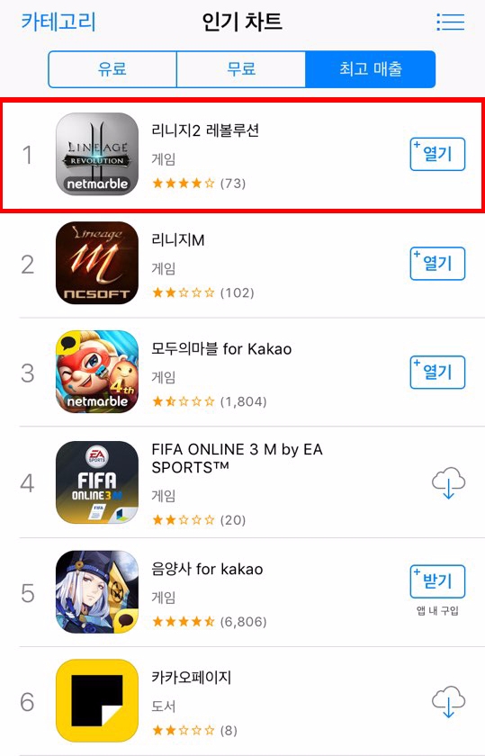 [글로벌이코노믹 신진섭 기자] 넷마블게임즈의 모바일 MMROPG(대규모다중접속역할수행게임) ‘리니지2 레볼루션(이하 레볼루션)’이 5일 애플 앱스토어 매출 1위를 탈환했다.