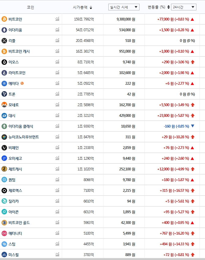 이오스, 에이다, 대시, 모네로, 비체인, 오미세고, 퀀텀, 제트캐시, 아이콘, 질리카 등은 크게 오르고 있다.