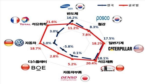 반면, ▲석유화학(LG화학 3.0% vs 토탈 21.6%) ▲자동차(현대자동차 1.0% vs 폭스바겐 18.7%) ▲디스플레이(삼성디스플레이 –5.8% vs BOE 2.8%) ▲자동차부품(현대모비스 0.1% vs 덴소 5.2%) ▲석유제품(SK이노베이션 18.1% vs 시노펙 20.4%) ▲일반기계(두산인프라코어 17.5% vs 캐터필러 18.2%) 등으로 나타났다.