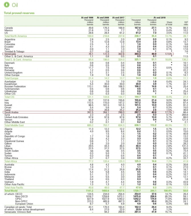 영국 에너지회사 BP가 11일(현지시간) 공개한 보고서에 따르면, 원유 매장량 1위 베네수엘라의 지난해 말 원유 확인 매장량(Proved Reserves)은 3033억 배럴로 10년 전인 2008년 말(1723억 배럴)보다 무려 1.7배 크게 늘어났다.