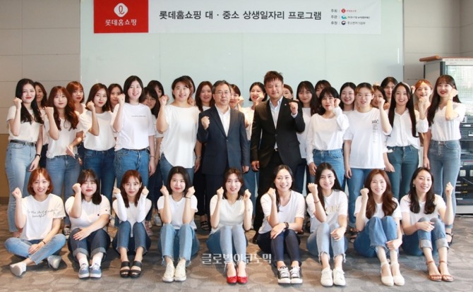 롯데홈쇼핑은 지난 17일, 서울 상암동 중소기업 DMC타워에서 '여성 인재 양성 프로그램 2기' 발대식을 진행하고, 관계자들과 교육생이 기념사진을 촬영하고 있다. (두 번째 줄 왼쪽 여섯 번째부터) 김광곤 대중소기업농어업협력재단 본부장, 정윤상 롯데홈쇼핑 커뮤니케이션부문장. 사진=롯데홈쇼핑