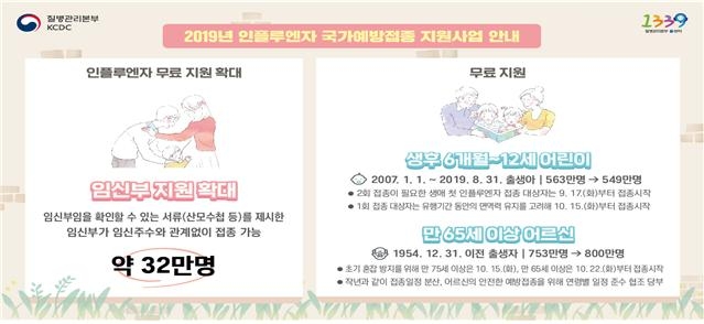이에 따라 올해는 전 국민의 27%인 1381만 명이 인플루엔자 무료접종의 혜택을 받을 수 있게 된다. 생후 6개월∼12세 어린이(2007년 1월 1일∼2019년 8월 31일 출생아)가 549만 명, 임신부가 약 32만 명, 65세 이상(1954년 12월 31일 이전 출생자)이 800만 명이다.