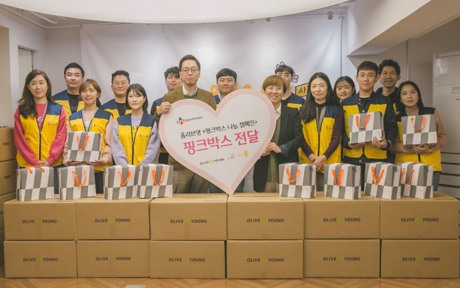 ‘핑크박스 나눔 캠페인’은 올리브영의 대표적인 사회 공헌 활동이다. 올리브영은 일명 ‘깔창 생리대’가 사회적 문제로 떠오른 2016년부터 매년 이 캠페인을 전개해왔다. 이는 올리브영 임직원들이 직접 만든 면 생리대와 각종 위생용품이 담긴 핑크박스를 저소득층 여성 청소년에게 무상 지원하는 활동이다. 올리브영은 현재까지 약 4600명의 저소득층 여성 청소년들을 지원했다.
