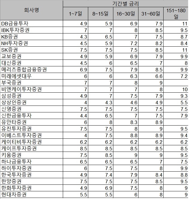 돈을 빌리는 기간이 늘어날수록 증권회사들은 투자자들에게 고금리를 적용하고 있다.