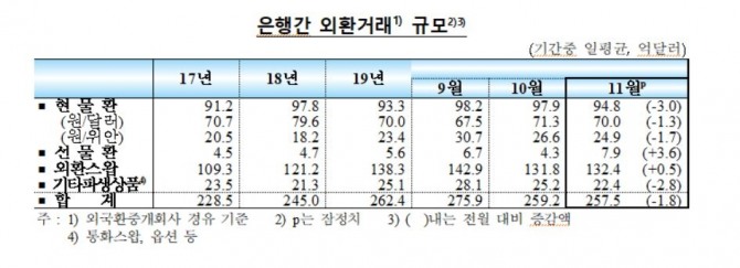 지난 11월 외국환 중개회사를 경유한 국내 은행 간 일평균 외환거래 규모는 257억5000만 달러로 전분기 거래량인 279억2000만 달러보다 1억8000만 달러 감소했다. 국내 외환시장은 국내 경제지표 부진이 지속되는 가운데 미·중 무역협상 불확실성 재부각, 홍콩·위구르 인권법안에 따른 미·중간 갈등 우려 등 대외리스크 요인에 영향을 받았다.