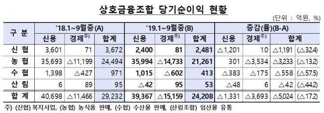 이미지 확대보기10일 금융감독원이 발표한 ‘19.1~9월중 상호금융조합 영업실적(잠정)’에 따르면 신협, 농협, 수협, 산림조합 등 2230개 상호금융조합의 3분기 누적 당기순이익은 2조4208억 원이다. 지난해 같은 기간 2조9232억 원보다 5024억 원, 17.2% 감소한 실적이다.