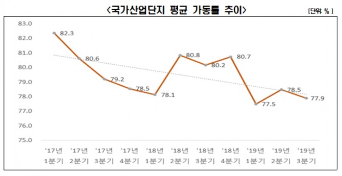평균가동률도 낮아졌다. 올해 1~3분기 동안 국가산업단지 평균 가동률은 77.9%를 기록했다. 2017년 1분기 82.3%에서 4.4%포인트 하락한 수치다. 평균 가동률은 2017년 1분기부터 5분기 연속 하락하다 2018년 2분기 다시 80%선을 회복했으나, 2019년 1분기 중 77.5%로 하락한 이후 80%선을 회복하지 못하고 있다.