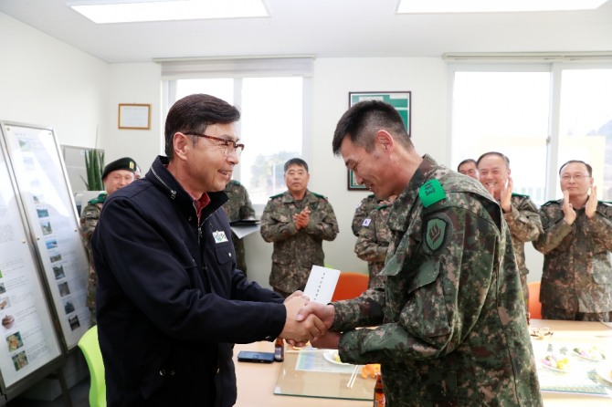 김철우 전남 보성군수가 20일, 설 명절을 대비해 지역 방위와 치안 유지에 온 힘을 쏟고 있는 군·경·예비군을 위문했다. 이날 김 군수는 보성경찰서, 보성군 예비군 지역대를 방문해 “병역의무 수행에 어려움이 많겠지만 군민의 안위를 위해 지역방위와 치안유지에 최선을 다해줄 것”을 당부했으며 의무경찰 및 군 장병, 예비군들에게 감사의 뜻으로 보성사랑 상품권을 전달했다. /전남 보성군=제공
