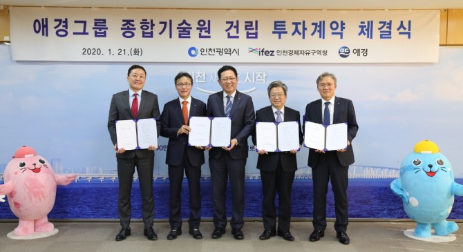 이미지 확대보기애경그룹은 21일 ‘애경그룹 송도 종합기술원(가칭)’ 설립을 위해 인천경제자유구역청과 인천 송도국제도시 첨단산업클러스터 B구역 내에 위치한 부지 2만8722㎡를 345억 원에 매수하는 계약을 체결했다고 밝혔다.