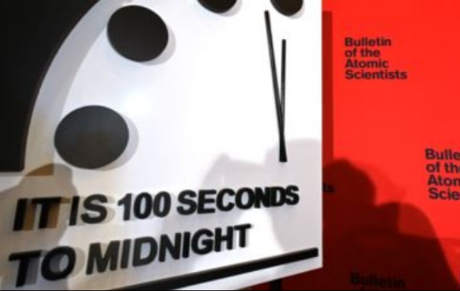 이미지 확대보기미 과학 잡지 ‘블레틴 오브 아토믹 사이언티스트(Bulletin of the Atomic Scientists·BAS)’는 23일(현지시간) 지구멸망까지의 시간을 나타내는 ‘종말시계’의 바늘을 진행시켜 자정까지의 남은 시간을 역대 최단인 ‘100초’로 설정했다. 종말시계 자정은 세계의 끝을 상징적으로 나타내며 이 잡지는 매년 현재시각을 결정한다.