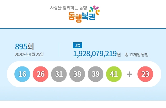 895회 로또 당첨번호 16·26·31·38·39·41, 보너스 번호 23…1등 12명 당첨금 각 19억3000만원