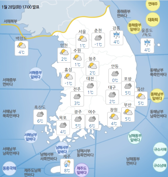 또 “29일 종일, 서해상과 남해상에는 천둥과 번개가 치는 곳이 있겠고, 동해상은 2월 1일까지 물결이 2.0~6.0m로 매우 높게 일겠으니, 항해나 조업하는 선박은 각별히 유의하기 바란다”고 밝혔다.