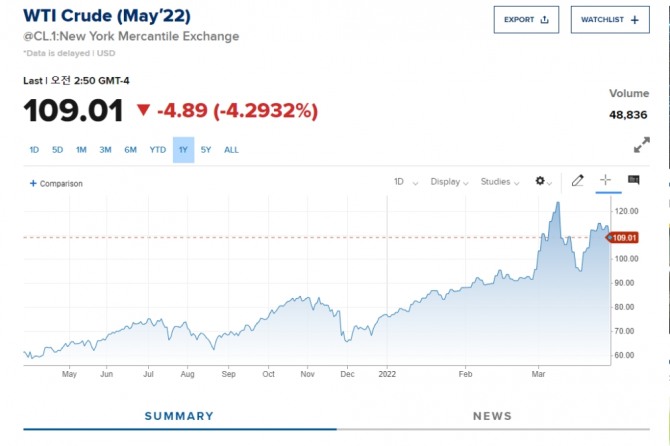28일 로이터통신에 따르면 이시각 현제 뉴욕선물시장에서 미국의 주종 원유인 서부 텍사스산 원유(WTI)는 4% 이상 떨어진 배럴당 109달러선에서 거래되고 있다. (표 참조) 브렌트유도 4%가량 하락한 상태로 움직이고 있다. 러시아와 우크라이나의 5차 평화협상이 시작되는 데다 중국 상하이가 코로나19로 순환식 도시 봉쇄에 들어감에 따라 중국 원유 수요 감소 우려가 제기된 데 따른 것으로 보인다. 중국 상하이 봉쇄에 따른 중국 원유 수요 감소 우려와 예멘 반군의 사우디아라비아 석유 시설 공격 일시 중단이 국제유가를 끌어내리고 있다,