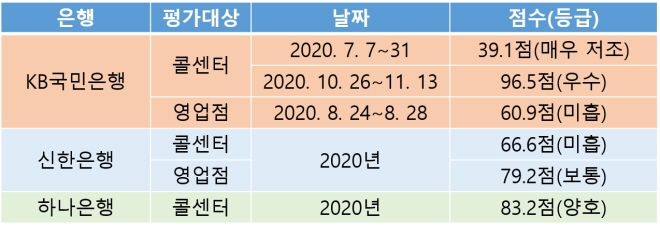 신한은행의 경우 2020년 콜센터에서 66.6점으로 '미흡'을, 영업점에선 79.2점으로 '보통' 등급을 받았다. 또 같은 해 하나은행은 콜센터에서 83.2점으로 유일하게 '양호' 등급을 받았다.