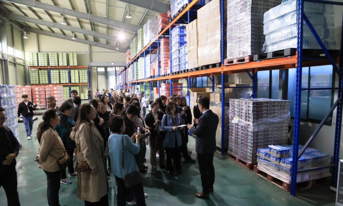 희망브리지 직원이 파주 재해구호물류센터에 동북아 5개국 사회복지인들에게 물류센터 현황과 구호물품 등을 설명하고 있다. /사진=희망브리지