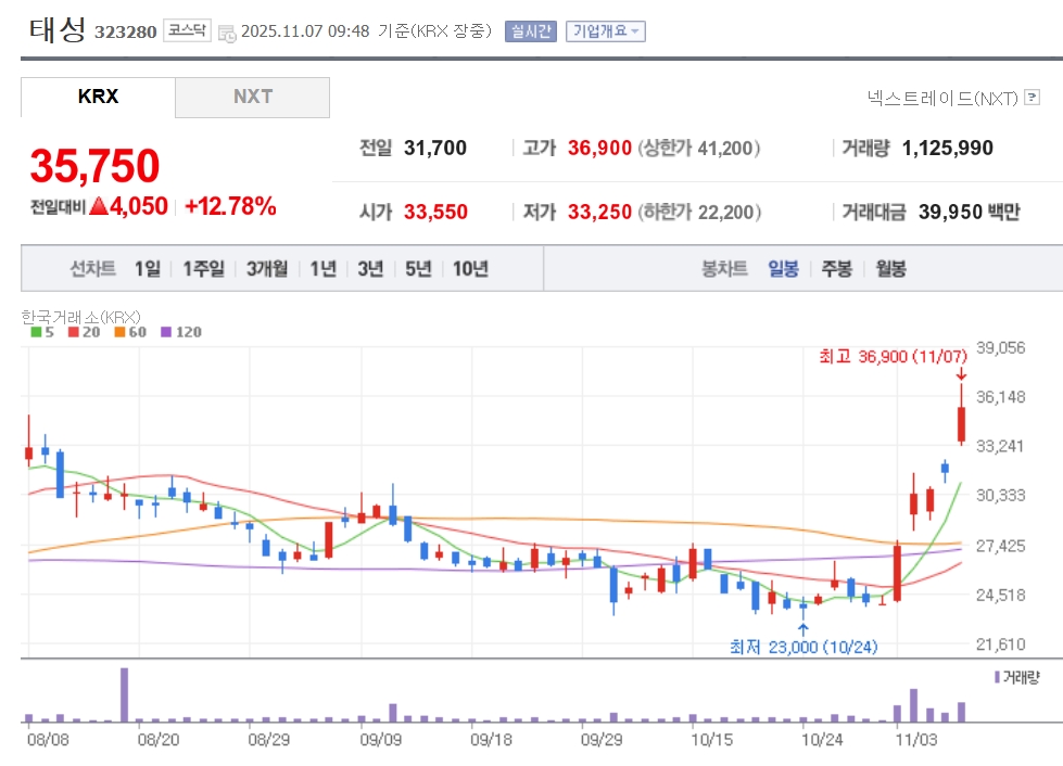 이미지 확대보기7일 한국거래소에 따르면 오전 9시 48분 기준 태성은 전일 대비 12.78% 상승한 3만575원에 거래되고 있다.