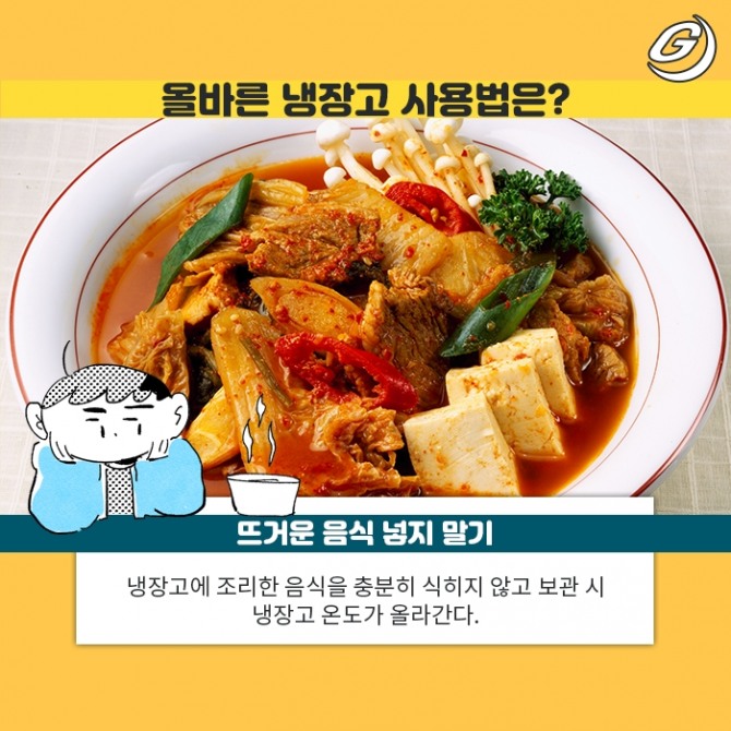 냉장고에 조리한 음식을 충분히 식히지 않고 보관 시 냉장고 온도가 올라간다. 또한 평균 온도를 유지하기 위해 더 많은 전력을 사용한다.
