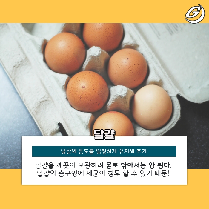 달걀을 깨끗이 보관하려 물로 닦아서는 안 된다. 달걀의 숨구멍에 세균이 침투 할 수 있기 때문!
