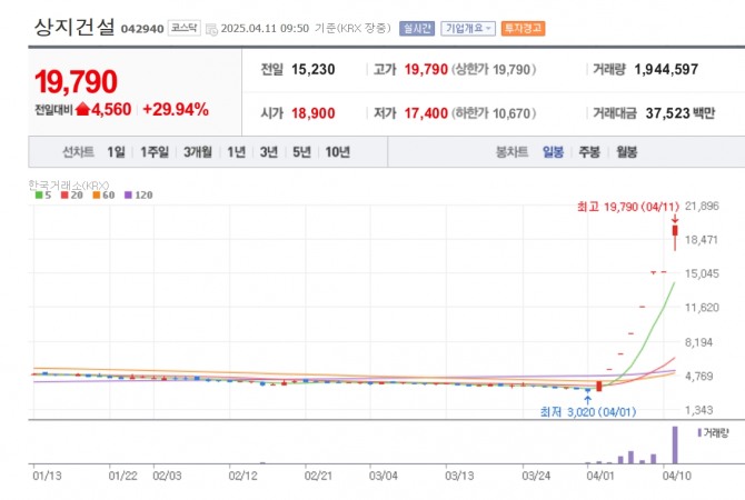 상지건설의 시가총액은 지난해 말 189억원에 불과했으나, 이날 상한가로 788억원까지 커졌다.