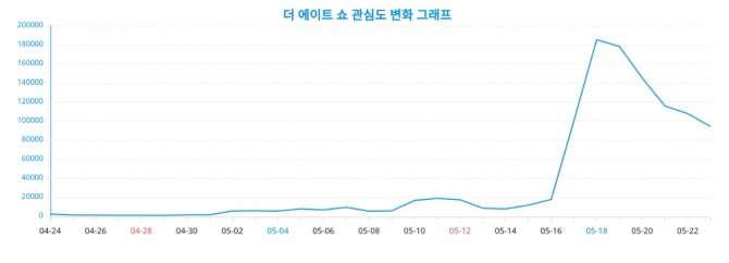 이미지 확대보기더 에이트 쇼의 변화 추이를 보여주는 트렌드지수 그래프는 현재 94,523 포인트를 나타내며, 이는 전일 108,122 포인트에서 하락한 결과이다.