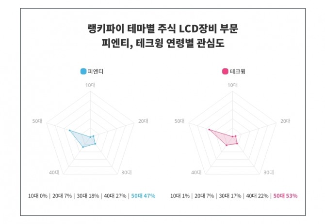 이미지 확대보기랭키파이의 분석에 따르면, 피엔티와 테크윙 사이에서 연령별 관심도 분포가 뚜렷이 나타났다. 피엔티는 50대에서 47%로 가장 높은 관심도를 보여주며, 10대 0%, 20대 7%, 30대 18%, 40대 27%, 50대 47% 순으로 연령대별로 관심이 분포되었다.