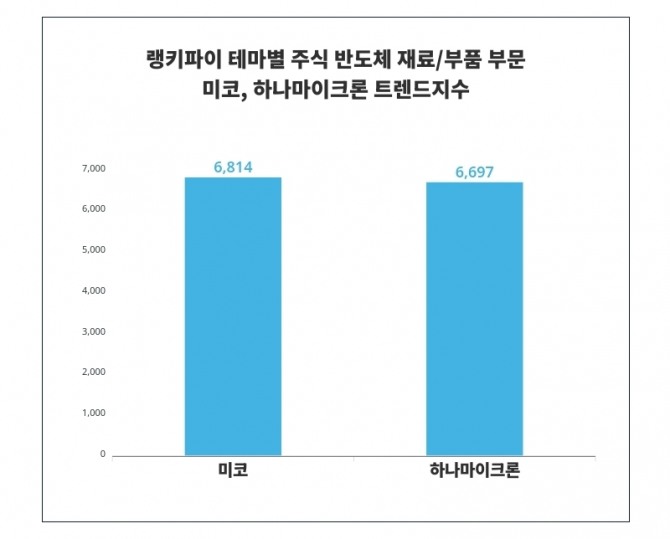 랭키파이의 최신 데이터에 따르면, 테마별 주식 반도체 재료/부품 부문 트렌드지수 부문에서 미코가 6814포인트로 최고점을 기록하며 선두를 유지하고 있다. 하나마이크론이 6697포인트로 뒤를 따르고 있으며, 점수 차이는 117포인트이다.