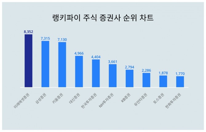 랭키파이는 10일 빅데이터를 기반으로 전주 키워드 검색량과 구글 트렌드점수를 합산해 산출한 주식 증권사 부문 트렌드지수를 발표했다.