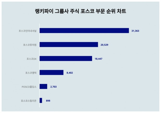 한편, 4위는 포스코엠텍, 5위 POSCO홀딩스, 6위 포스코스틸리온 순이다.