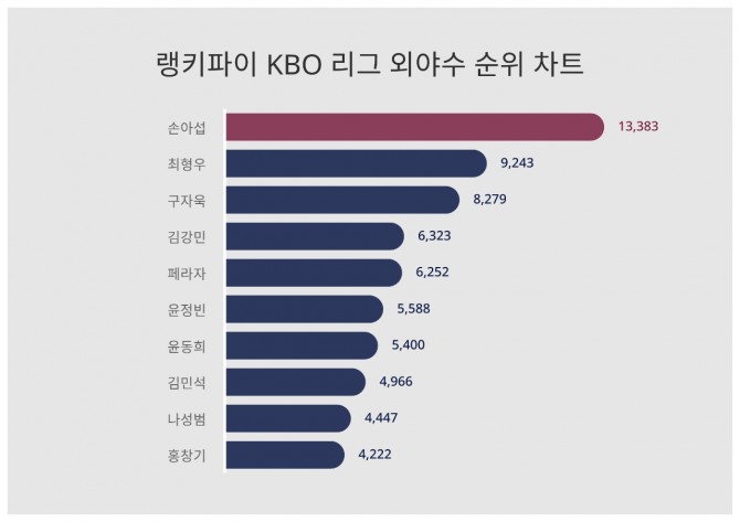24일 랭키파이는 자체적인 빅데이터 분석 시스템을 통해 6월 4주차 기준 KBO 리그 외야수 트렌드지수 를 발표했다. 1위는 여전히 손아섭이다.