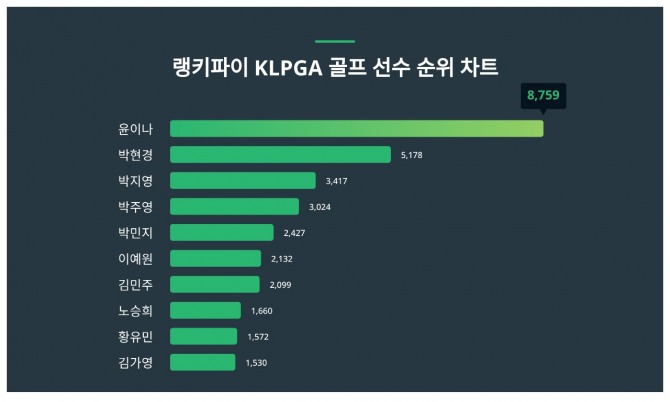 랭키파이는 25일 KLPGA 골프 선수 트렌드지수 및 순위를 공개한 가운데 윤이나 선수가 1위로 떠올랐다.