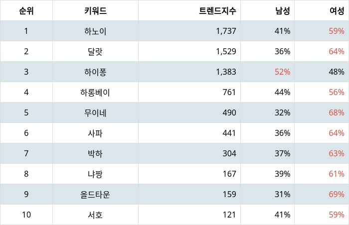 랭키파이에 따르면 7월 1주차 기준 베트남 선호 여행지 트렌드지수 1위는 하노이, 2위는 달랏이다.