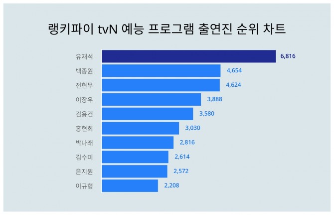 이미지 확대보기6816포인트를 받은 유재석이 tvN 예능 프로그램 출연진 트렌드지수 1위에 올랐다. 이어 2위는 백종원으로 4654포인트를 기록했다.