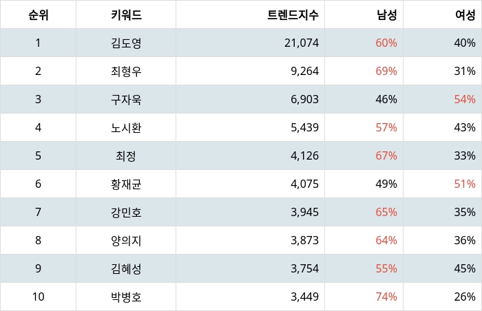 먼저, 성별을 보면 1위 김도영은 남성 60%, 여성 40%, 2위 최형우는 남성 69%, 여성 31%, 3위 구자욱은 남성 46%, 여성 54%, 5위 최정은 남성 67%, 여성 33%임을 확인할 수 있었다.