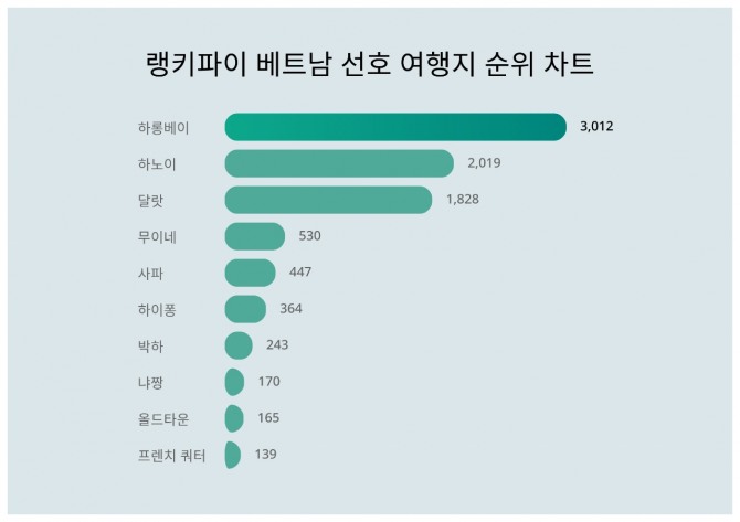 랭키파이에 따르면 7월 4주차 기준 베트남 선호 여행지 트렌드지수 1위는 하롱베이, 2위는 하노이이다.