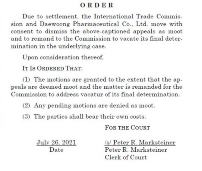 이미지 확대보기이는 지난달 메디톡스가 대웅제약의 미국 파트너사 이온바이오파마와 합의를 체결한 후, 미국 소송의 목적을 달성했다는 판단에 따라 신청한 항소 철회에 따른 것이다. 미국 항소법원의 기각(MOOT)결정은 미국 ITC로 환송되며, ITC는 항소법원의 결정을 참고하여 최종판결을 무효화 할 것으로 예상된다.