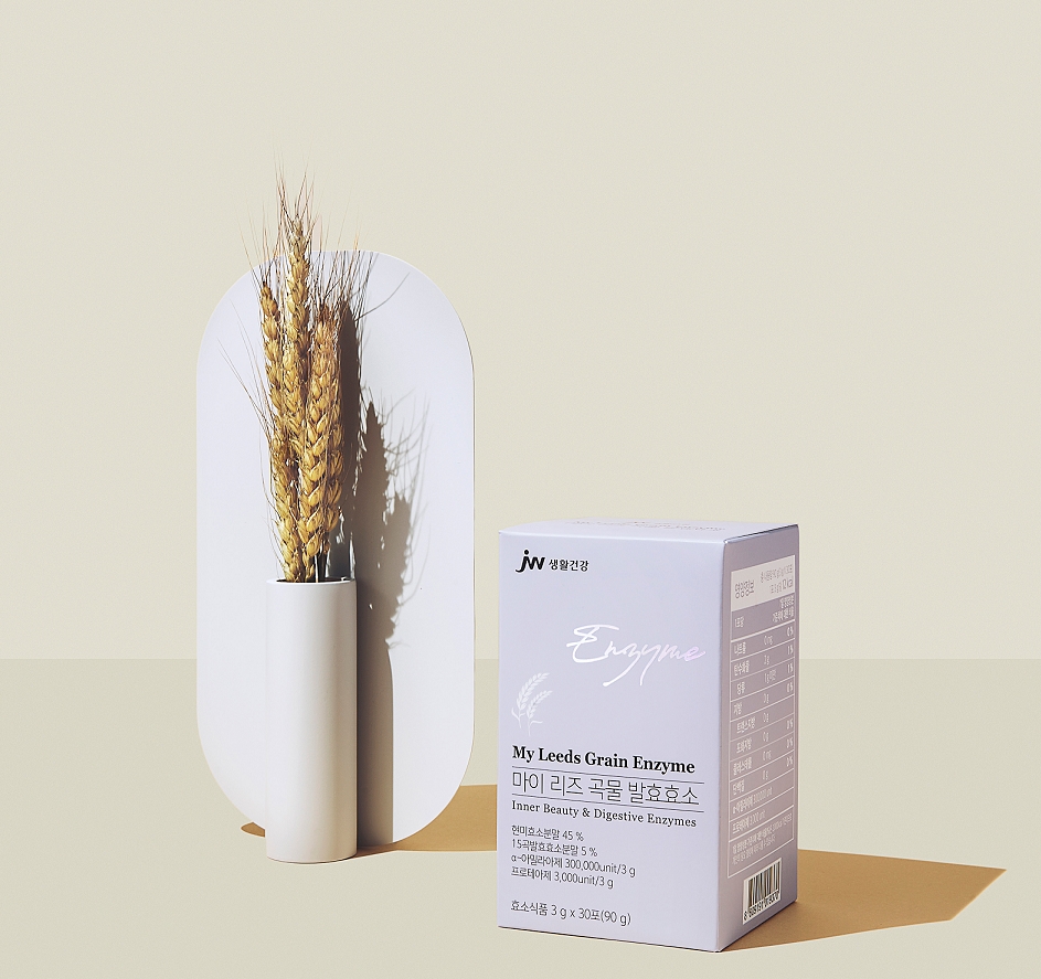 ‘마이 리즈 곡물발효효소’는 현미, 보리, 통밀, 검정콩, 팥 등 15종의 곡물을 발효해 만든 효소식품이다. 총 7종의 분해효소를 담았으며, 1포당 아밀라아제‧프로테아제 소화효소가 303,000unit 함유됐다.
