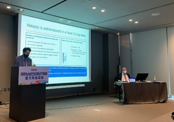 대한남성건강갱년기학회장인 문두건 고려의대 비뇨의학과 교수는 '새틀라이트 심포지움– 나테스토(Satellite Symposium–Natesto)' 섹션의 좌장으로 나섰고, 박민구 인제의대 비뇨의학과 교수가 'Initial clinical experience of Natesto(나테스토의 초기 임상 경험)'란 주제로 강연을 펼쳤다. 또 류지간 인하의대 비뇨의학과 교수, 이동섭 가톨릭의대 비뇨의학과 교수가 패널로 참석해 성선기능저하증에 대한 진단과 진료 현장에서의 케이스 리뷰를 통한 의견을 제시했다.