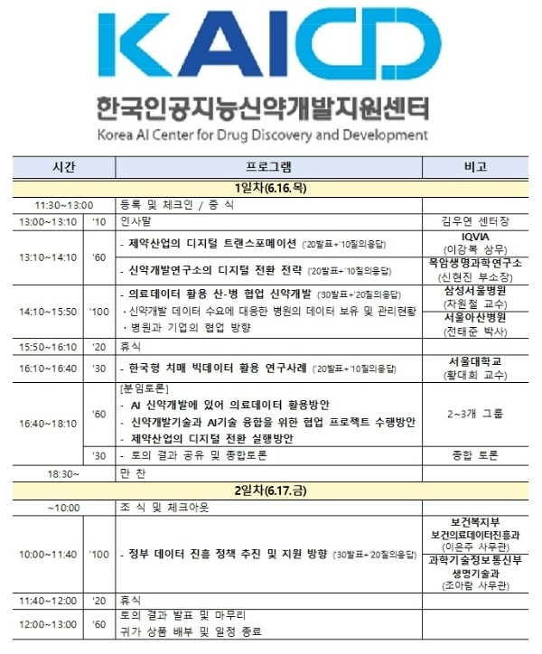 정부 관계자를 비롯해 신약개발 연구원과 AI 개발자 60명이 참석하는 이번 워크숍에서는 제약바이오산업의 디지털 전환 동향을 파악하고, 연구중심병원의 의료데이터 보유·관리현황, 의료데이터 활용 사례, 정부의 신약개발과 데이터 진흥 정책 등을 두루 점검할 계획이다.