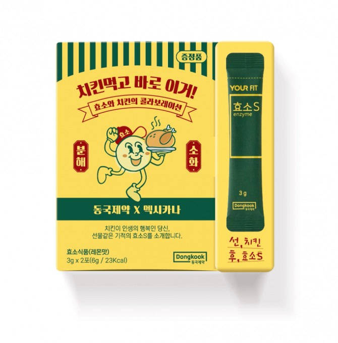 이미지 확대보기이번 협업은 동국제약의 소화효소 7종이 들어간 인기제품 유어핏 효소S와 치킨 프랜차이즈 멕시카나 신제품의 만남으로 야식으로 자주 먹게 되는 치킨을 소화 걱정없이 즐기자는 취지로 기획됐다.
