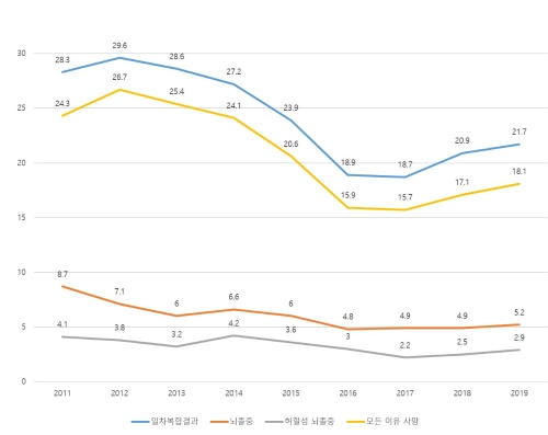 NOAC은 심방세동 환자에서 뇌졸중 및 전신 색전증의 일차 및 이차 예방을 위해 강력하게 권고됐지만 지난 10여 년간 NOAC이 심방세동을 동반한 뇌졸중 환자의 예후를 어떻게 개선 시키는 지에 관한 연구는 없었다. 이에 연구팀은 국내 19개 병원 뇌졸중 환자 데이터(CRCS-K 뇌졸중 레지스트리)를 통해 NOAC이 도입되기 전인 지난 2011년부터 NOAC 처방률이 75%를 넘긴 2019년까지 심방세동을 동반한 뇌졸중 환자의 연도별 혈관 사건을 분석하며 혈관 사건의 변화에 NOAC이 미친 매개 효과를 확인했다.
