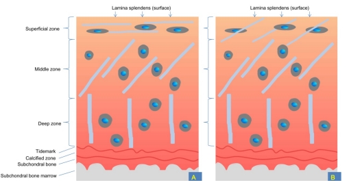 무릎관절 마찰면의 구조를 층층히 분해해보면 관절면은 초자연골(hyaline cartilage)이라는 연골로 이루어져 있다. 모든 연골은 다당류(polysaccharide)인 프로테오글리칸(preteoglycan), 섬유형단백질(fibrous protein; collagen, elastin, fibrin), 간질 체액(iterstitial fluid)으로 구성된다.