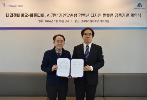 이미지 확대보기이번 공동 연구 개발 협약에 따라 양사는 환자 맞춤형 신항원 기반 암백신 개발에 협력한다. 테라젠바이오는 신항원 백신 연구 분야에 대한 최신 지식에 근거한 자문 및 면역원성에 대한 실험적 검증 데이터를 제공하고 아론티어가 보유한 신항원의 면역원성을 예측하는 기술을 활용할 수 있게 됐다.