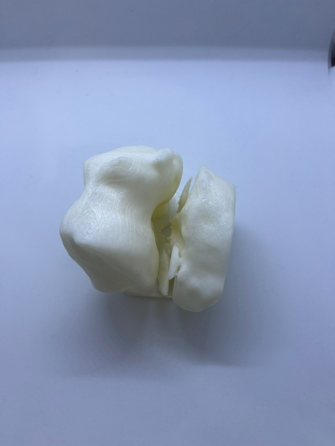 이미지 확대보기최근에는 외부에서 연골을 형성하여 이식하거나 3D프린터로 결손부를 재연하여 이식하는 기법들이 시도되고 있다. 두 가지 모두 조합하기 위해 일단 결손부를 3D 프린터로 조형한 후 자가 줄기세포를 뿌려 체외배양 하면서 연골로 유도하면 훨씬 완성도가 높은 이식 결과를 얻을 수 있다.