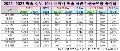이미지 확대보기7일 글로벌이코노믹이 전자공시시스템에 게재된 사업보고서를 기준으로 지난해 매출 상위 10대 전통제약사를 집계한 결과 △유한양행 △종근당 △대웅제약 △녹십자 △광동제약 △한미약품 △보령 △HK이노엔 △JW중외제약 △제일약품 순이었다. 10개사 중 매출 1조원대인 곳은 한미약품까지였다.