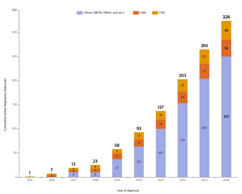 삼성바이오로직스는 지난 9월 기준 미국 식품의약국(FDA) 39건, 유럽 의약품청(EMA) 34건 등 총 326건의 제조 품목 규제기관 제조 승인을 획득했으며 생산능력 확장 및 수주 증가에 따라 해마다 승인 건수를 늘려가고 있다.
