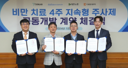 이미지 확대보기4사는 컨소시엄을 구성해 비임상부터 임상, 개발, 허가까지 각 사의 역량을 모아 신속하게 개발할 계획이다. 대웅제약은 티온랩 테라퓨틱스의 장기 지속형 약물 전달 플랫폼 기술인 '마이크로스피어'를 접목해 기존 주 1회 투여하던 비만 치료제의 투여 주기를 월 1회로 연장한다.